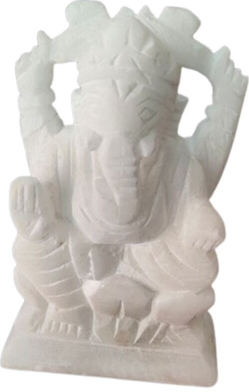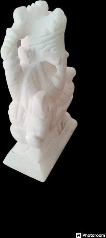 The artist has meticulously sculpted intricate details, from the delicate folds of Ganesh's attire to the expressive, gentle features of his face. His trunk is elegantly curved, symbolizing adaptability and strength, while his multiple arms are adorned with symbolic attributes, each rendered with precision. The marble's natural white hue is complemented by subtle veining, adding a touch of elegance and sophistication to the piece.